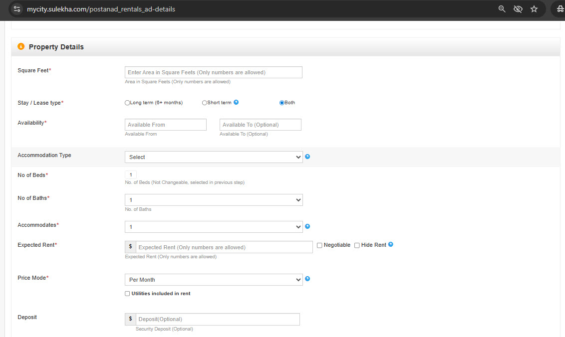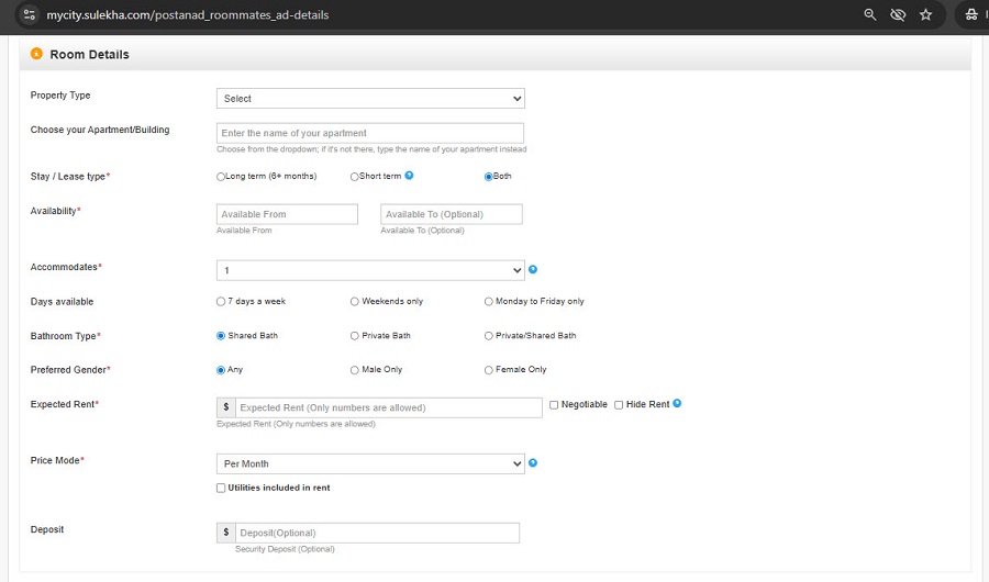Mention location, rent, room type (single, shared, PG), availability, furnishings, and roommate preferences (gender, smoking, pets, etc.). Property owners and agents can post the ad. The more information you include, the better chance you have of attracting higher quality applicants that are suited to your home.